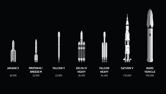 火箭会将这些配有服务设施的宇宙飞船送上飞往火星的轨道。这项任务所使用火箭动力将是土星5号(Saturn 5)火箭的两倍,后者曾把美国宇航员送上月球。马斯克称,预计每个充分使用的宇宙飞船大约能搭载100-200名乘客。