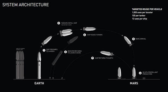 马斯克认为,相比于NASA庞杂的体系结构和垄断的国企背景,美国商业公司从事太空探索,能够有效降低成本,提高运营效率。主要表现在:推进器、宇宙飞船都将循环使用,形成一个全部可循环体系;飞船能够一次性运载足够多的人。