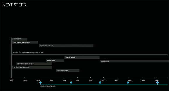 “我确信移民火星成功的可能之一就是建立起一个可以自我维持的、能够自行发展的火星殖民地。我现在确信它是行得通的。” 一年前,马斯克对 YC 合伙人 Sam Altman说,“我的火星计划是用十年时间,做到能够把一定数量的人类送上火星。快一点的话,大概需要九年。在这之前,我需要确保 SpaceX 不能死掉,确保我自己也不能死掉;或即便我真的死了,也要确保有人能把火星计划继续下去。”