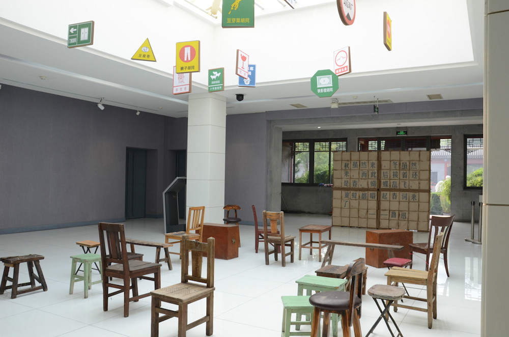 韩雪说,他们想制造一种时空交错的感觉,不要通过纯设计体现,而要关注文化。这种感觉不仅通过文学来传达,策展人之一的林婉嫕还在文学墙包围的中间空地上布置了一个老椅子交易市场,这些椅子来自于京城大街小巷里居民真实的生活物件,它们按照北京城每个区域的特点来摆放。在椅子上方,还吊着许多老胡同的指示牌,每个老地名都有着一个故事。