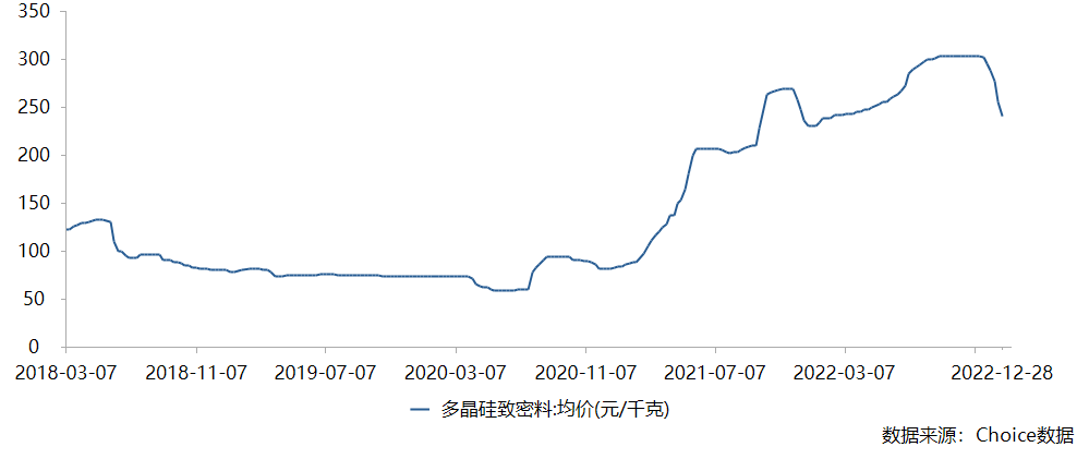 根据2023年1月4日最新的多晶硅致密料均价来看,从11月中旬至今,多晶硅致密料的价格已经从顶峰的302元/千克,下跌至目前的190元/千克,均价下跌达到37.09%;而且从趋势上来看,硅料价格下行趋势已经形成,大概率仍然会继续回调。