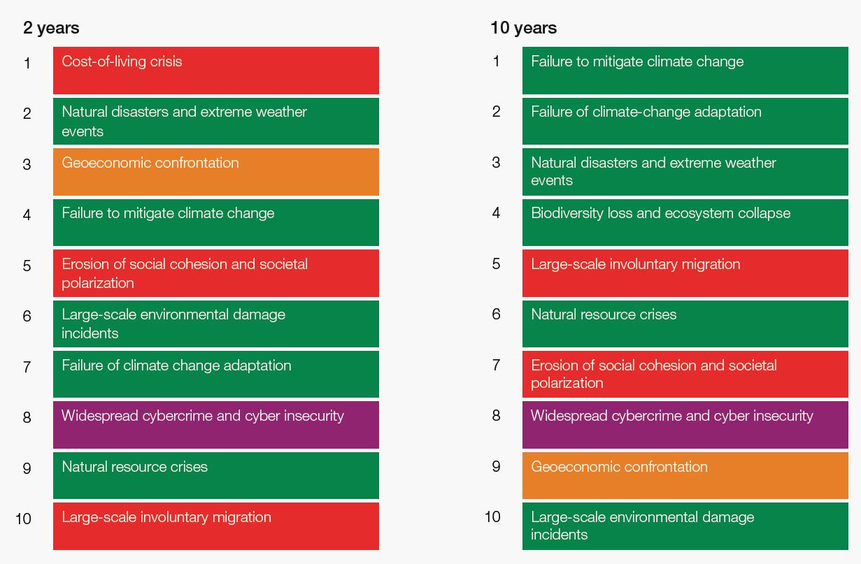 达沃斯论坛的年度全球风险报告也将生活成本上涨、极端天气和地缘经济对抗列为短期内的三大主要风险。