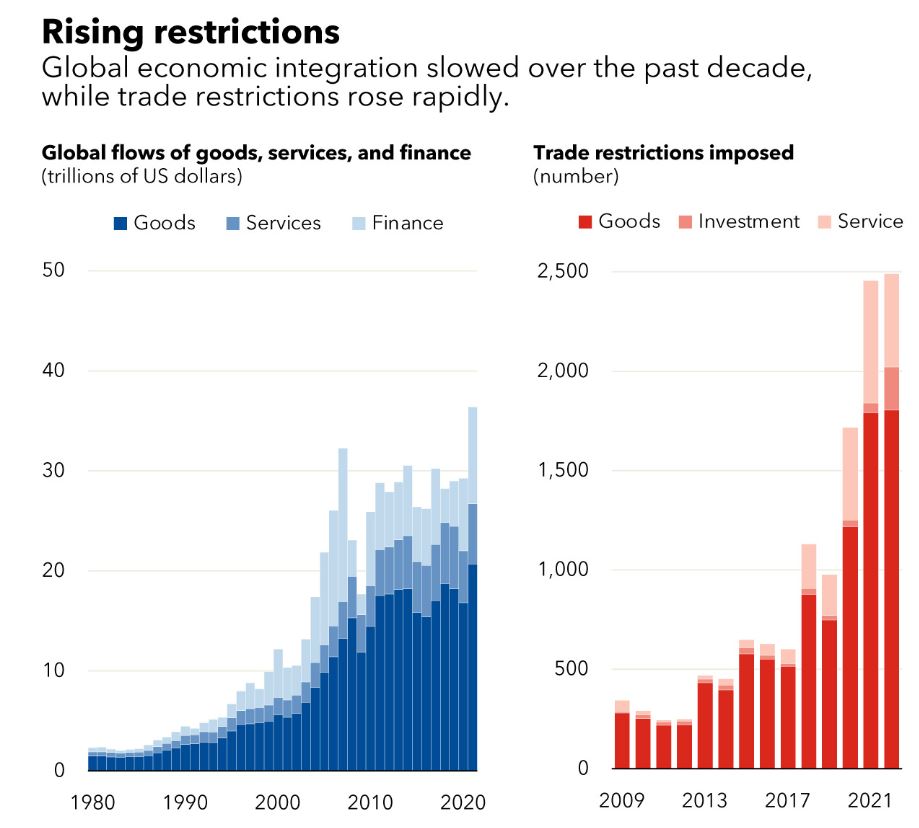 与此同时,各国对商品、投资和服务设立的贸易限制大幅增加,特别是2021年之后。