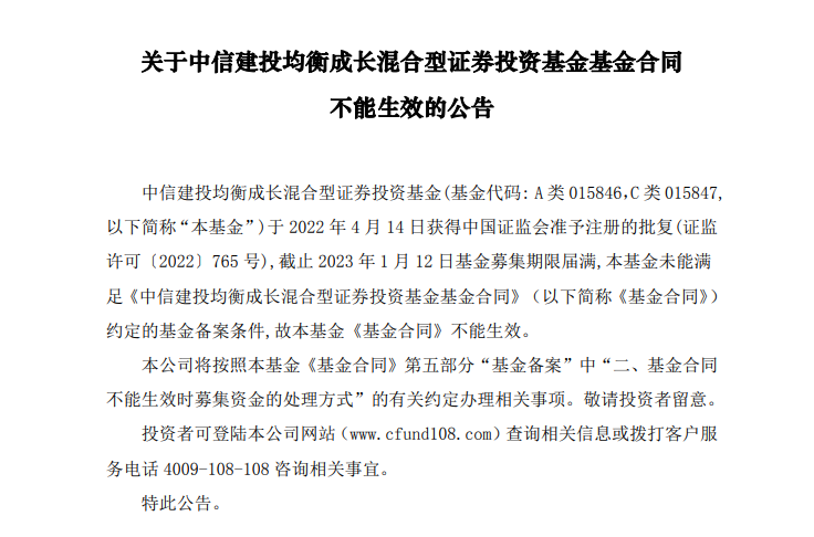1月14日,中信建投基金发布关于中信建投均衡成长合同不能生效的公告。公开资料显示,基金合同约定,自基金份额发售之日起3个月内,在基金募集份额总额不少于2亿份,基金募集金额不少于2亿元且基金认购人数不少于200人的条件下,验资通过后可以办理基金备案手续。