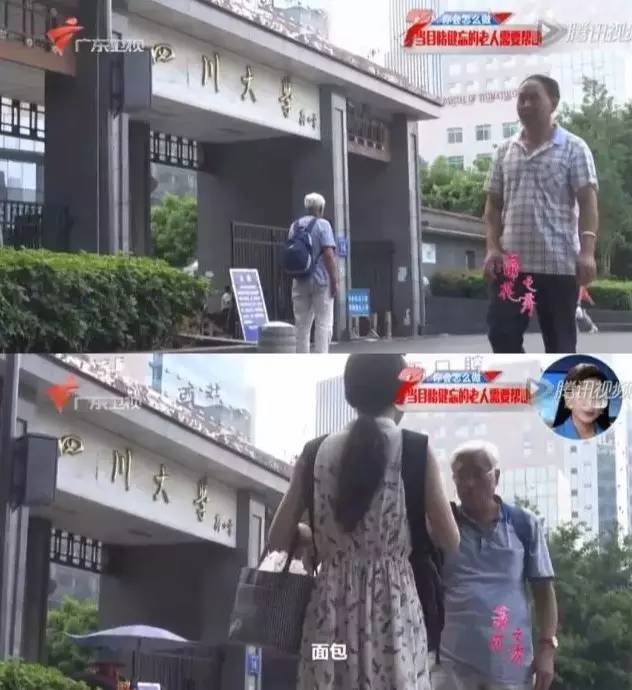 川大华西校区的门口,老人再次迷失在街头,并向一位路过的女孩儿索要食物。