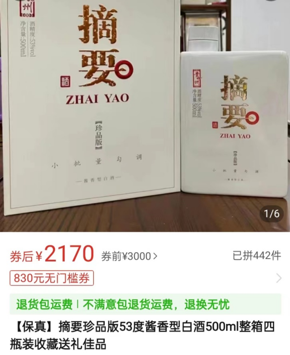 在拼多多平台上,某酒类商铺摘要珍藏版500ml的价格为540元左右一瓶,已售出400余件。