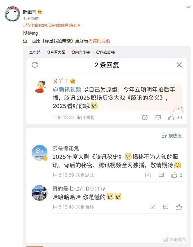 如此看来,马化腾开始对内部贪污行为下狠手了!有网友称这次事件为“鹅厂扫黑风暴”。还有网友表示,腾讯这次可以立项拍职场反贪大戏《腾讯的名义》。