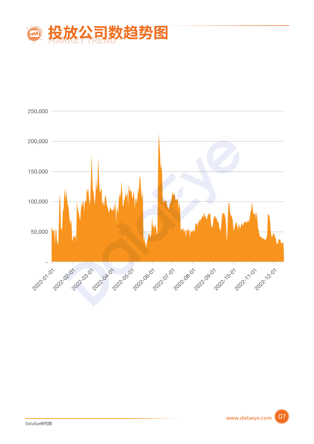整体来看,投放公司对比去年明显呈现增长趋势,今年上半年受疫情影响,一月中下旬到二月出现“投放低谷”,日投放商家不足50,000家;五一假期前后出现一波“投放高峰”,日投放商家高达100,000家。