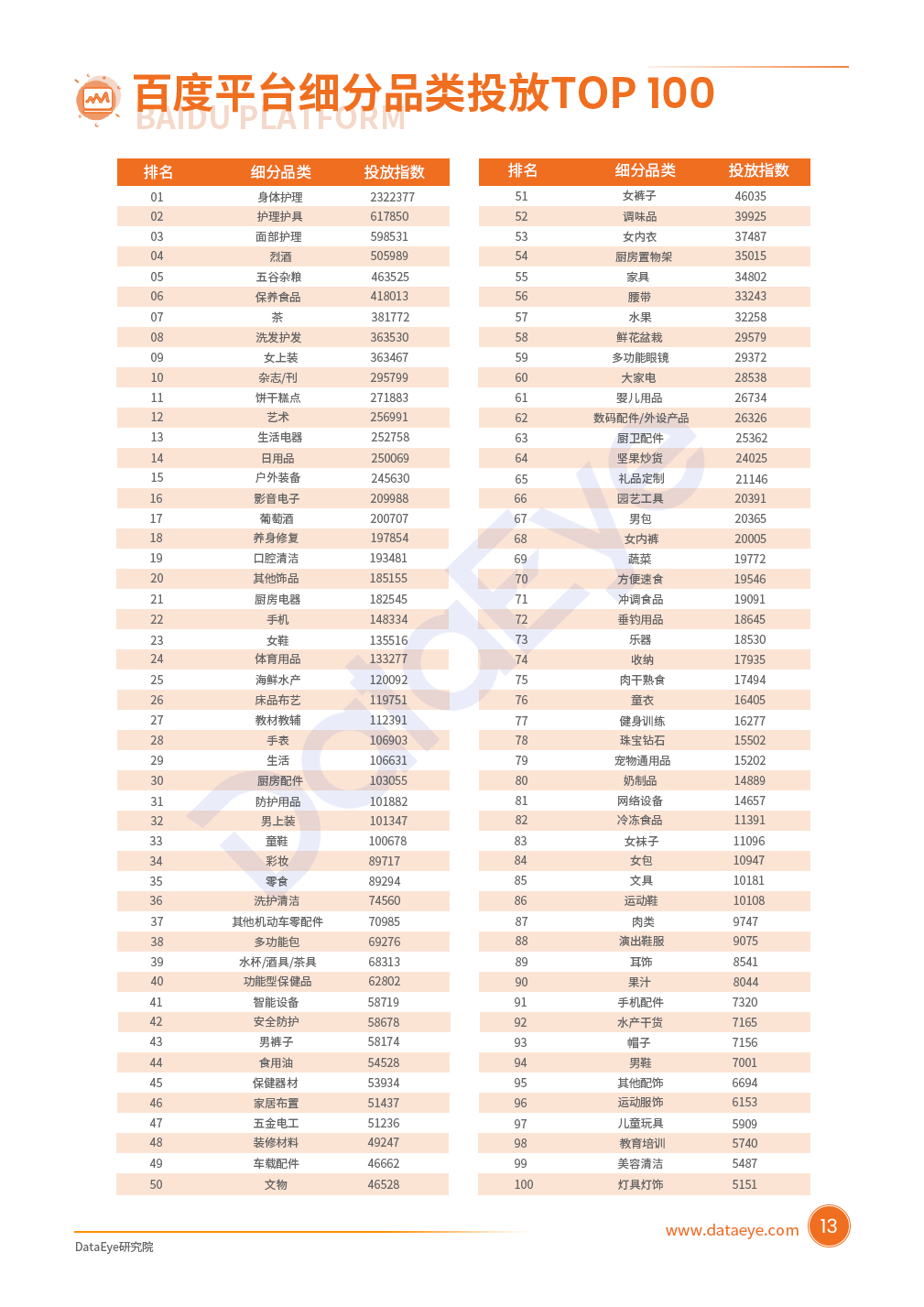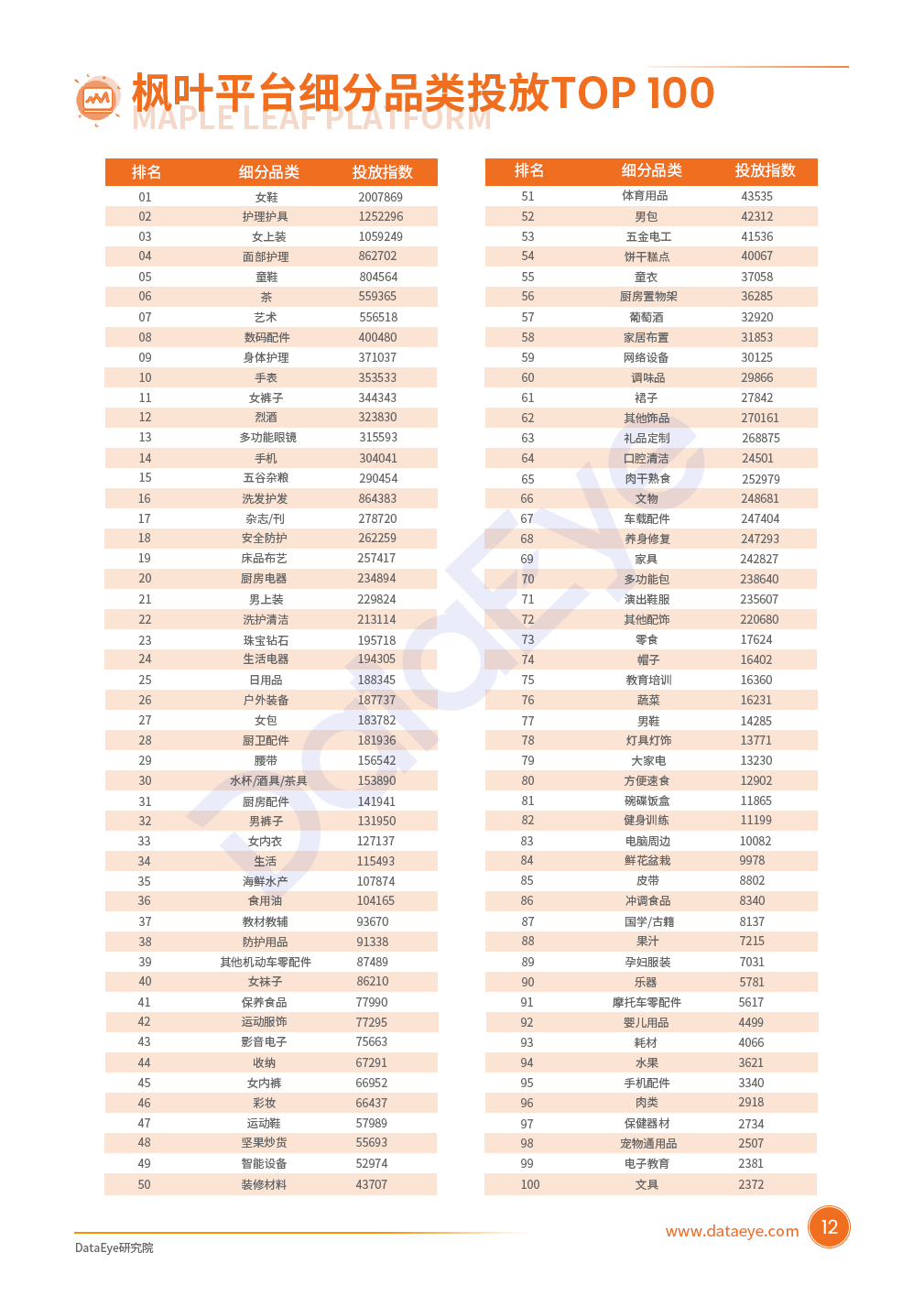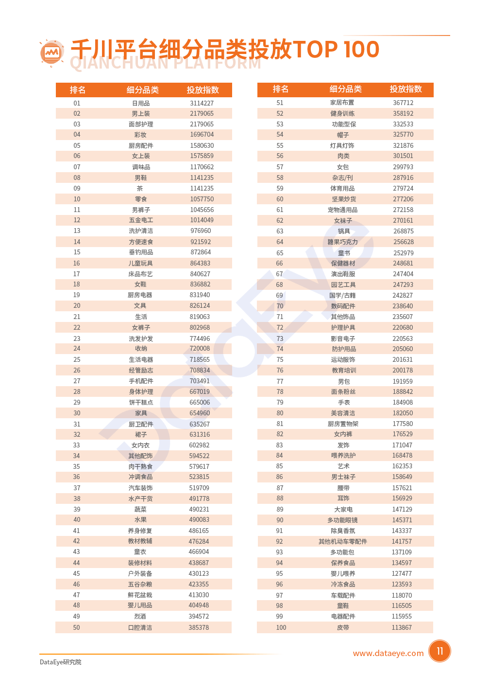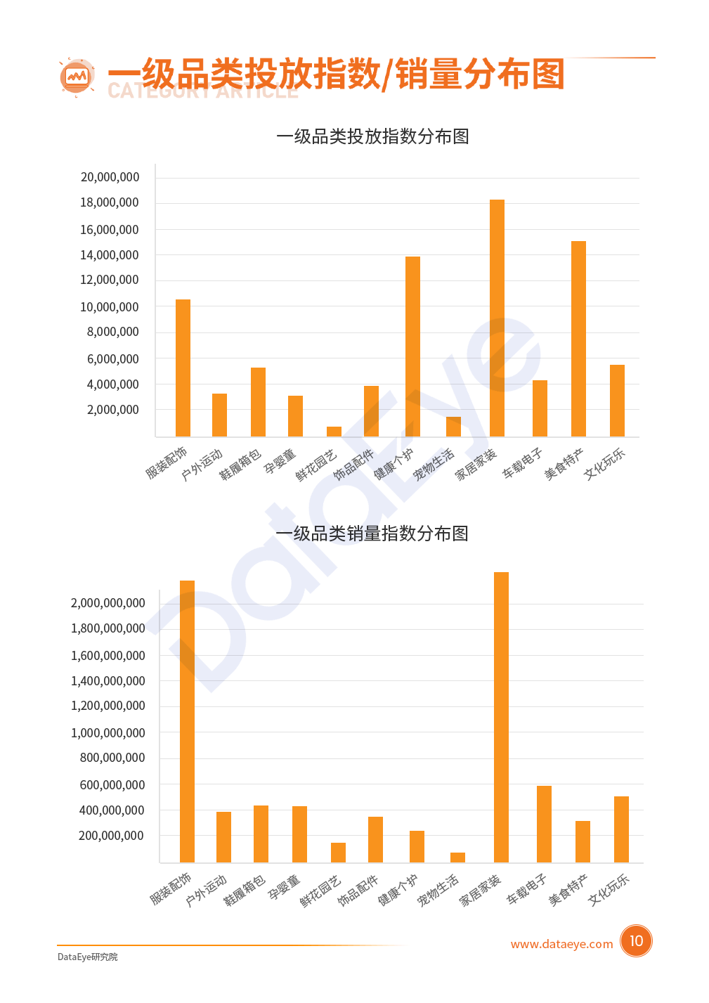 家居家装、美食特产、健康个护、服装配饰四大品类为投放主力军,投放指数均超过1,000W,占比超68%。