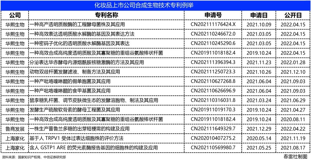 中信证券原料专题报告显示,目前国内化妆品上市公司中,华熙生物的合成生物技术领先行业。除了招牌的玻尿酸,华熙生物利用合成生物学生产的新原料涉及:依克多因、麦角硫因、葡萄糖苷、红景天苷等多种热门天然化妆品成分。