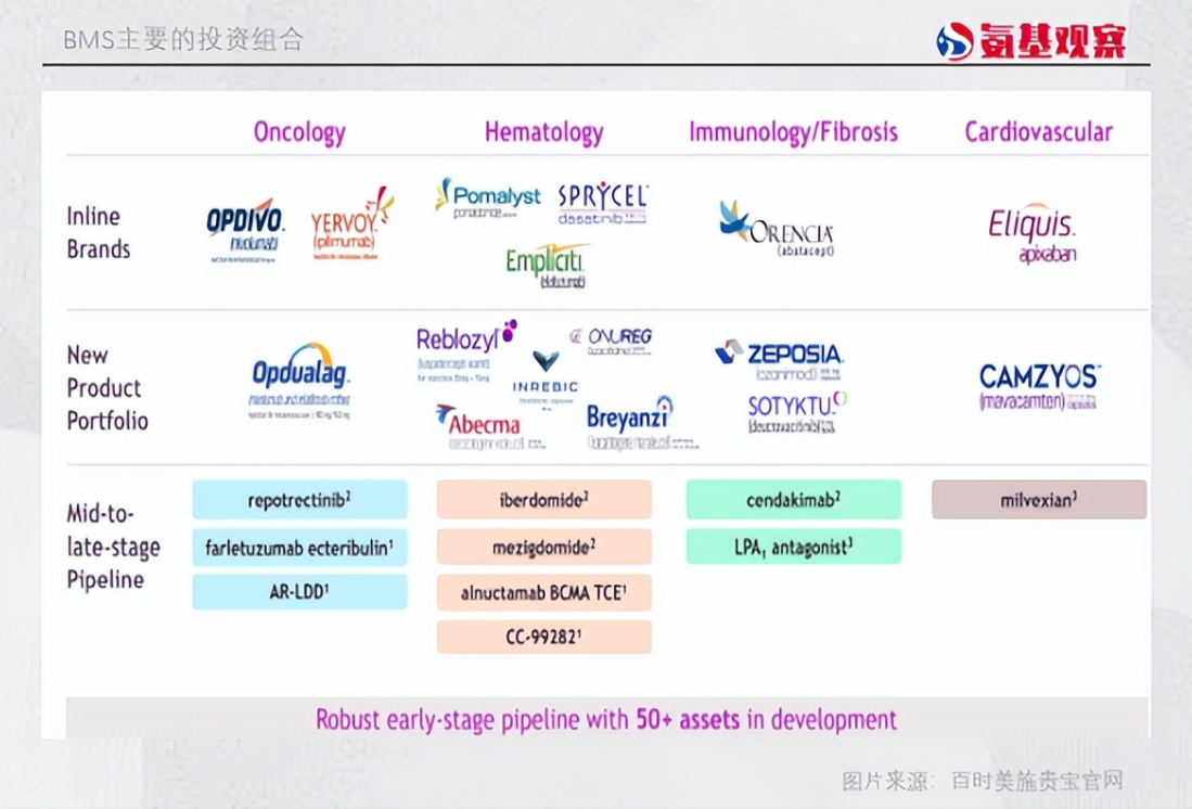 目前,百时美施贵宝围绕着肿瘤领域、血液领域、免疫领域、心血管领域四个板块进行了布局。未来,这些新产品组合将会大大抵消百时美施贵宝现有药物专利到期所带来的风险。按照百时美施贵宝预计,到2025年新的产品组合将为其带来100亿-130亿美元的收入。