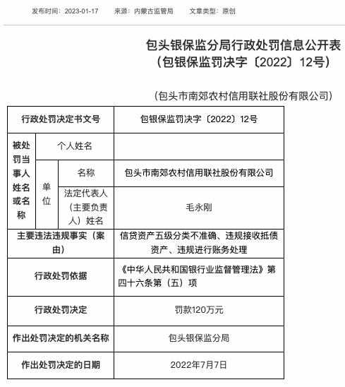 1月17日,包头银保监分局披露的行政处罚信息公开表显示,2022年7月7日,包头市南郊农村信用联社股份有限公司因信贷资产五级分类不准确、违规接收抵债资产、违规进行账务处理,被处以罚款120万元。