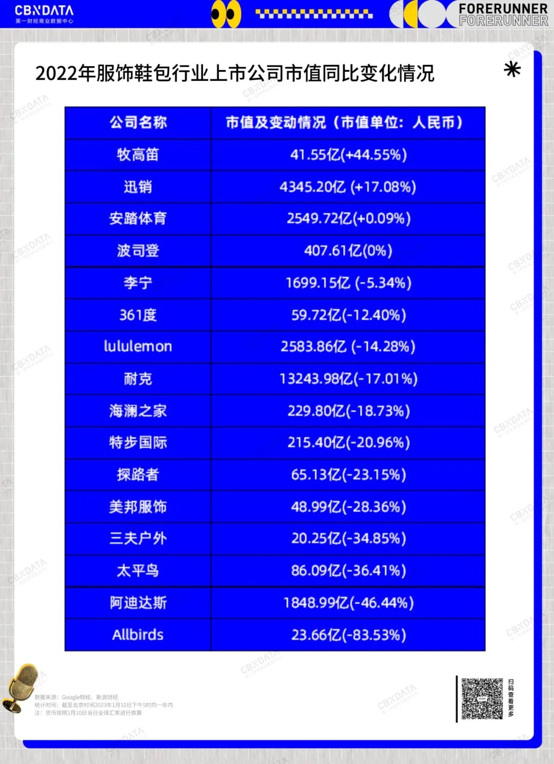 如何通过公司变化角度回看消费行业的2022?或许各上市消费企业的市值变动能说明一些问题。本篇系「先行者2023」系列观察第三篇,CBNData从2022年福布斯企业排名TOP500中筛选出了6大To C消费行业的相关公司,连同国内外部分明星上市消费公司一起做了对比,借此还原2022年资本市场对行业的态度。此外,CBNData对其中市值涨跌幅较大的重点公司进行了简单分析,希望通过这些公司寻找消费持续复苏下的微光。