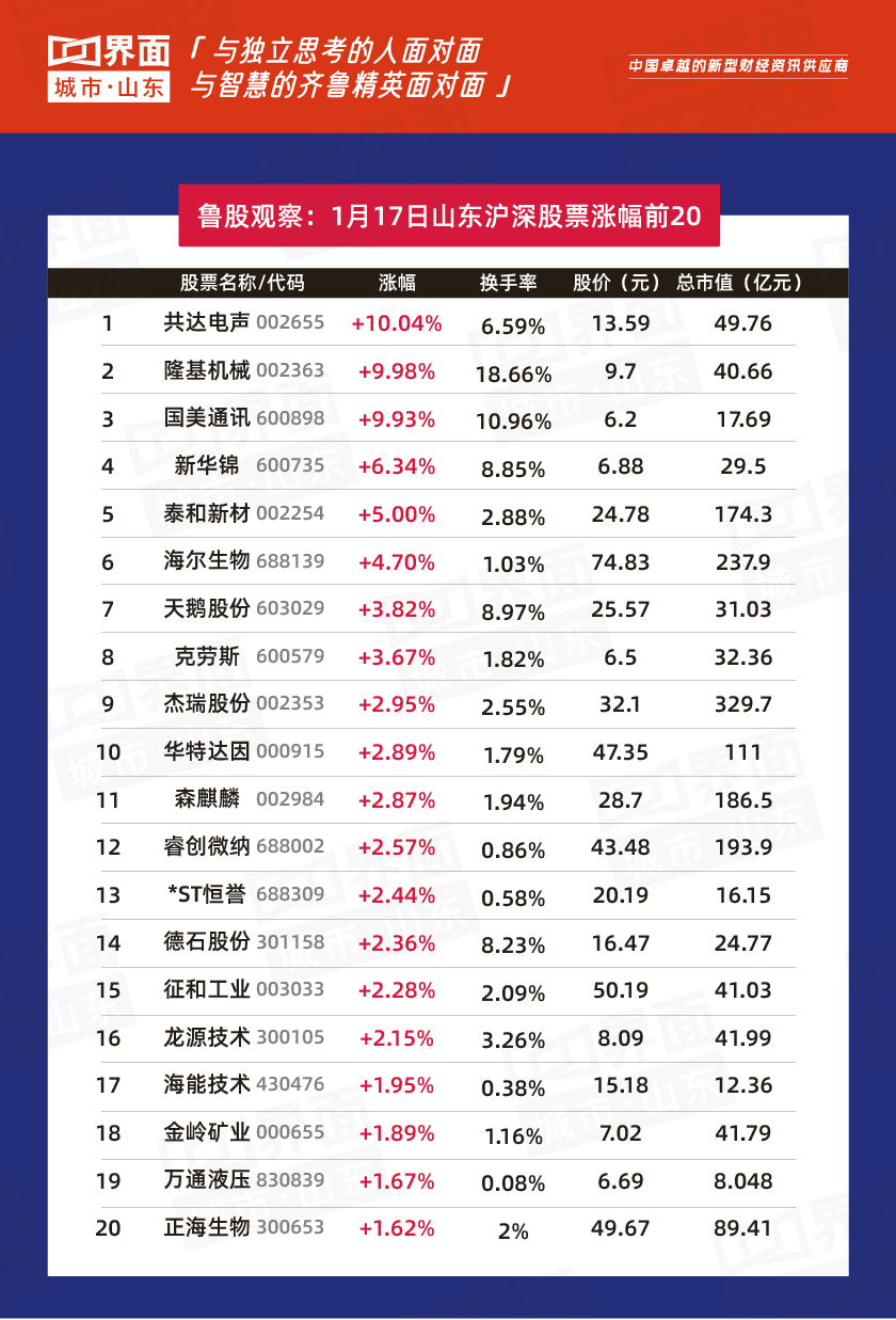 1月17日,山东省内沪深京股票有102只个股上涨,13股持平,174只下跌。