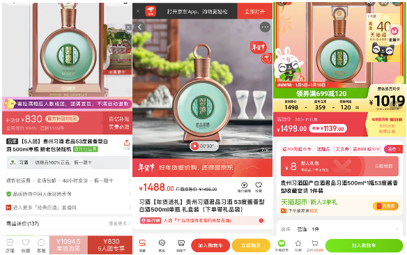 截图自贵州习酒拼多多、天猫、京东官方旗舰店