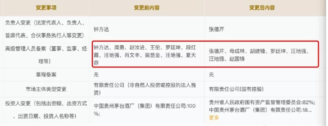 8月20日,习酒工商信息再次发生变更,从原先的贵州国资委变更为由贵州习酒投资控股集团有限责任公司、贵州省黔晟国有资产经营有限责任公司分别持股57%、25%,茅台集团持股18%,为第三大股东。