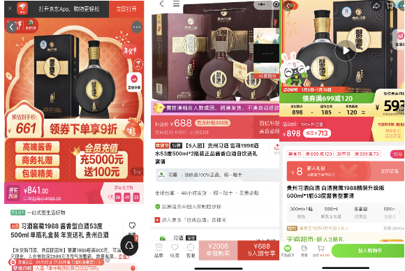 与很多二线高端白酒品牌类似,习酒产品也存在“价格倒挂”现象。新消费财研社注意到,君品习酒建议终端零售价为1498元,但多个电商平台到手价在830元-1000元左右。而窖藏1988建议零售价为898元,电商平台到手价多为593-688元左右。