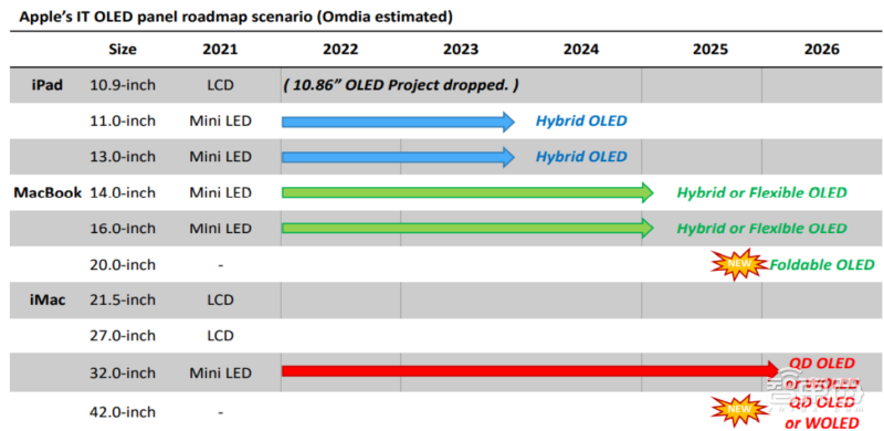 根据Omdia预测的一份苹果OLED屏幕迭代路线图,未来苹果的iPad、MacBook、iMac三条极为重要的产品线,都将会逐渐采用OLED屏幕。