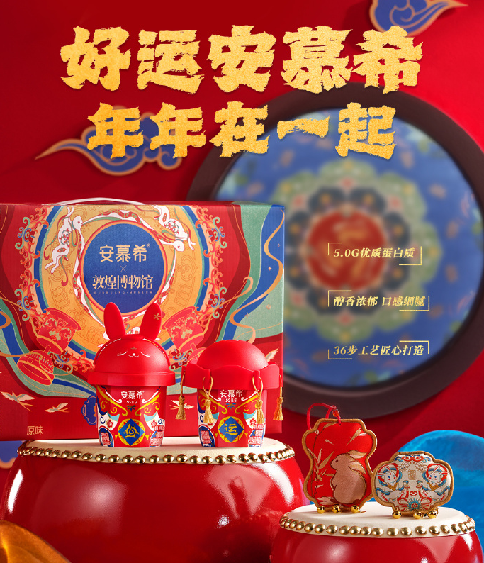 日前,安慕希携手敦煌博物馆推出限量惊喜联名IP产品,它以溯源敦煌藻井壁画与中华文明融合的神奇三兔共耳为创意形象,融于新品之中,寓意“美景、美味与美好”,让用户一开盖就能感受到联名产品所带来的美妙火花!(信息来源:品牌小红书)