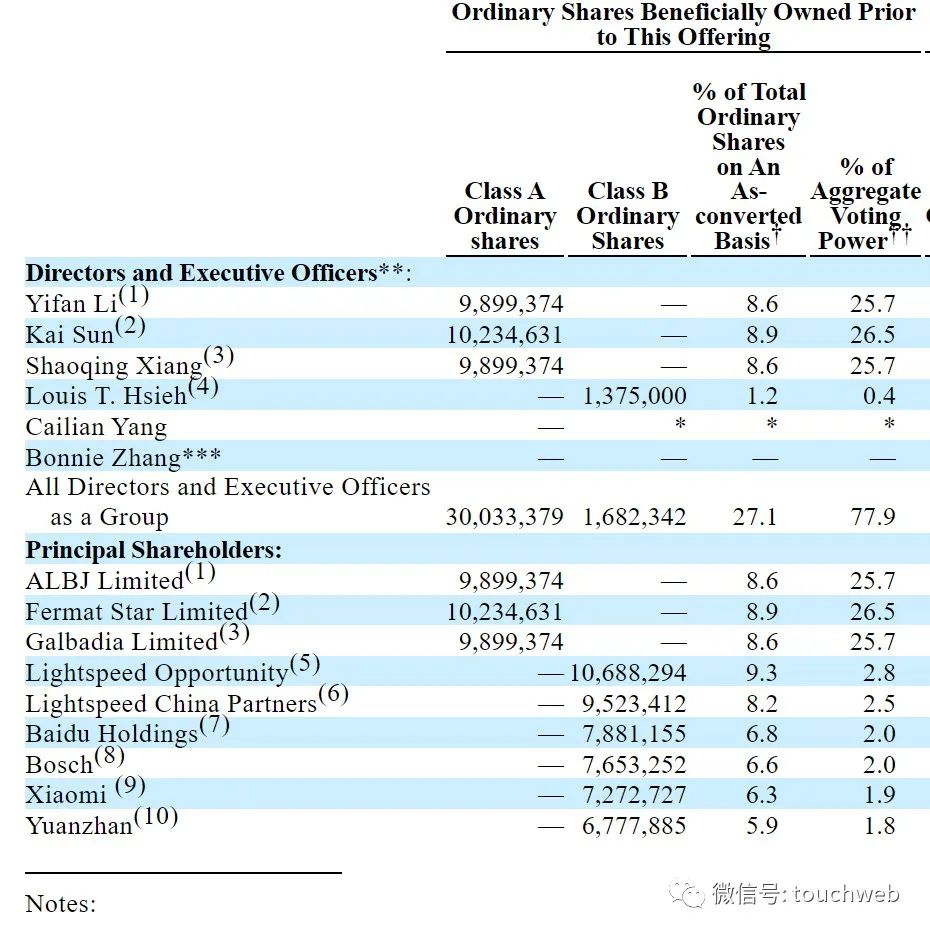 此外,Lightspeed Opportunity持股为9.3%,有2.8%的投票权;Lightspeed China Partners持股为8.2%,有2.5%的投票权;百度、Bosch(博世)分别持股为6.8%,有2%的投票权;小米持股为6.3%,有1.9%的投票权;Yuanzhan持股为5.9%,有1.8%的投票权。