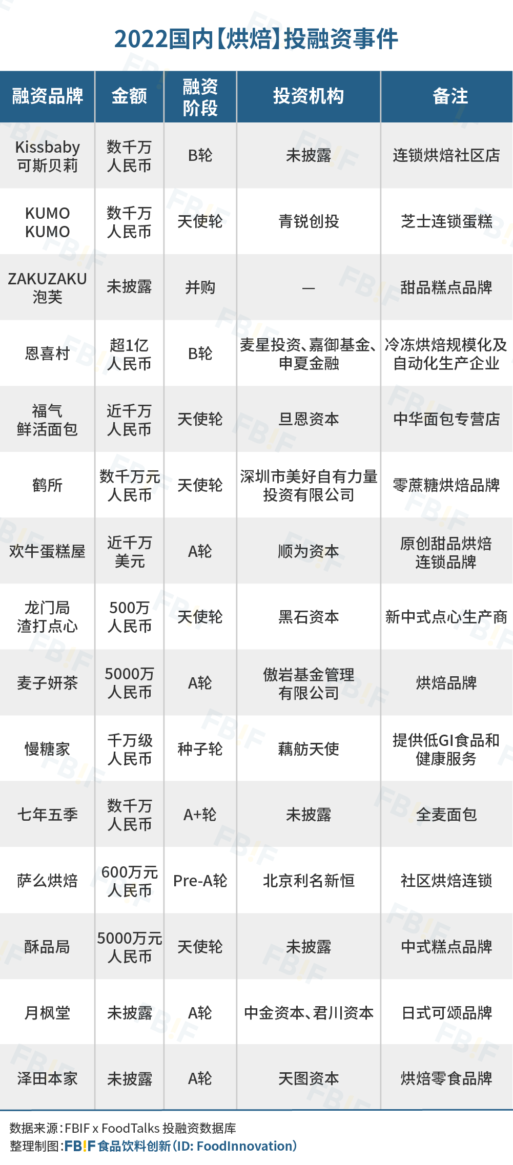 烘焙赛道投融资数量和2021年基本持平,但天使轮占比大幅增加,如KUMO KUMO、鹤所、龙门局渣打点心、酥品局等新品牌获得天使轮投资。Kissbaby可斯贝莉、恩喜村获得B轮投资。