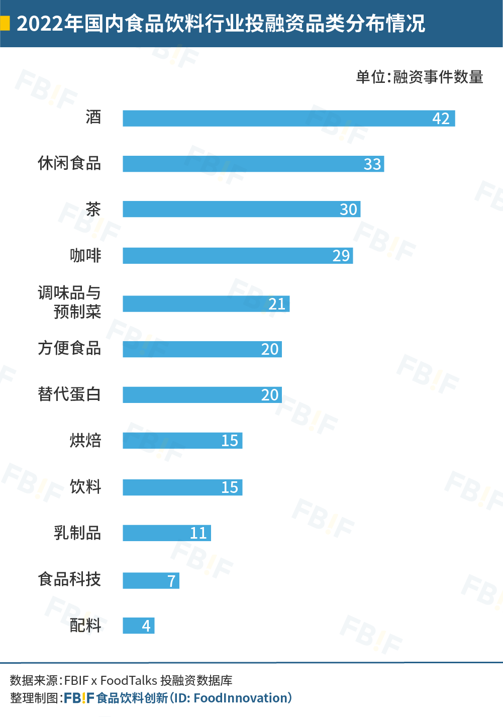 本次盘点中,我们将所有获得融资的品牌分为12大品类,包括酒、休闲食品、咖啡、茶、替代蛋白、方便食品、调味品与预制菜、食品科技、烘焙、乳制品、饮料、配料。