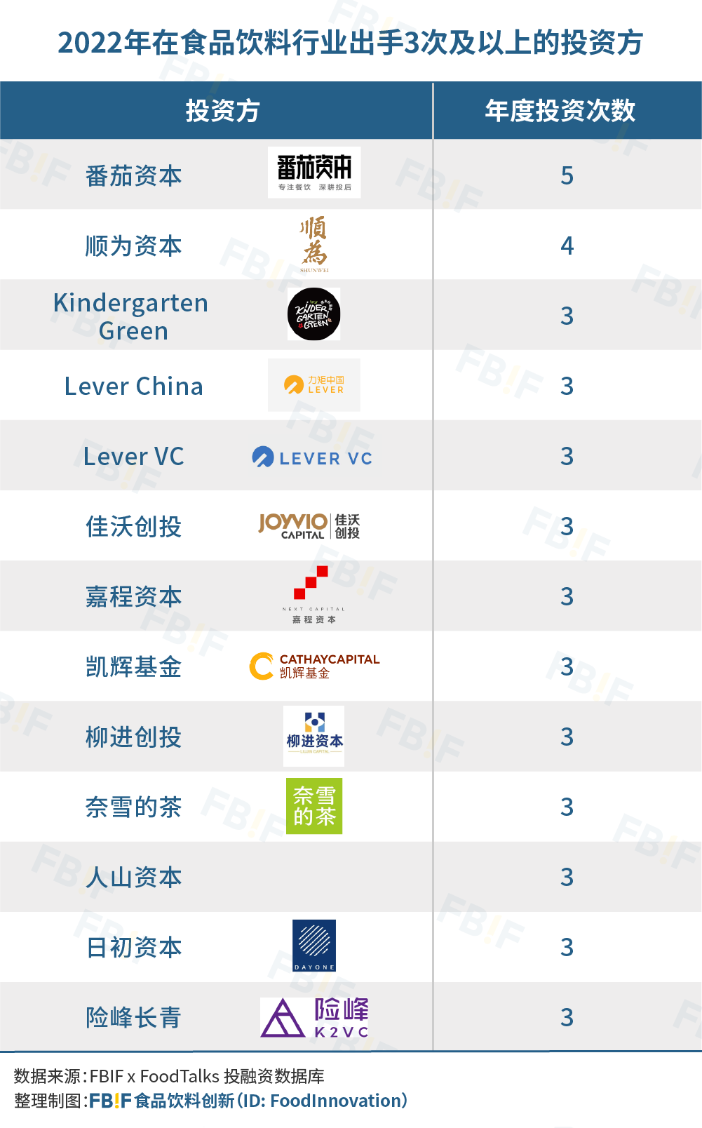 我们统计了2022年在食品饮料行业出手3次以上的投资方。与2021年相比,投资方出手次数明显下降。
