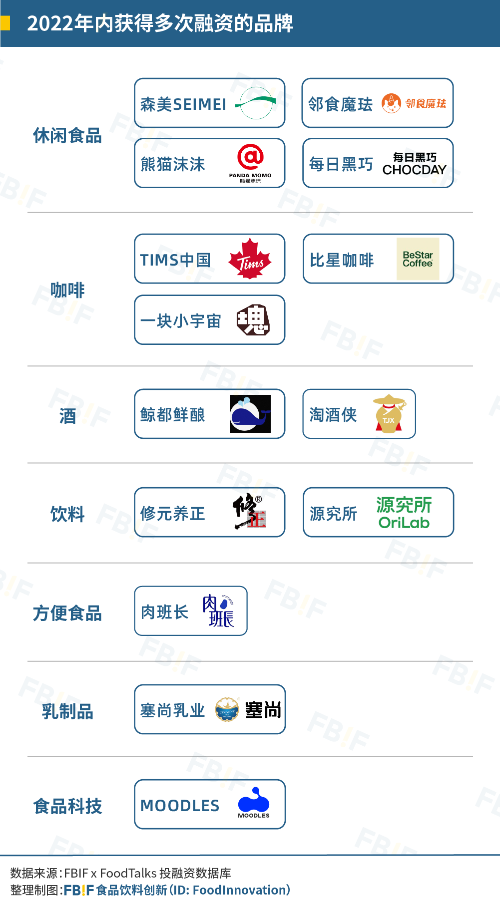 有7大品类的14家品牌在这一年里获得了多次(2次及以上)融资。相对于2021年有11大品类及37家品牌,2022年获得多次融资的品牌数量大幅下降,涉及的品类也更少。