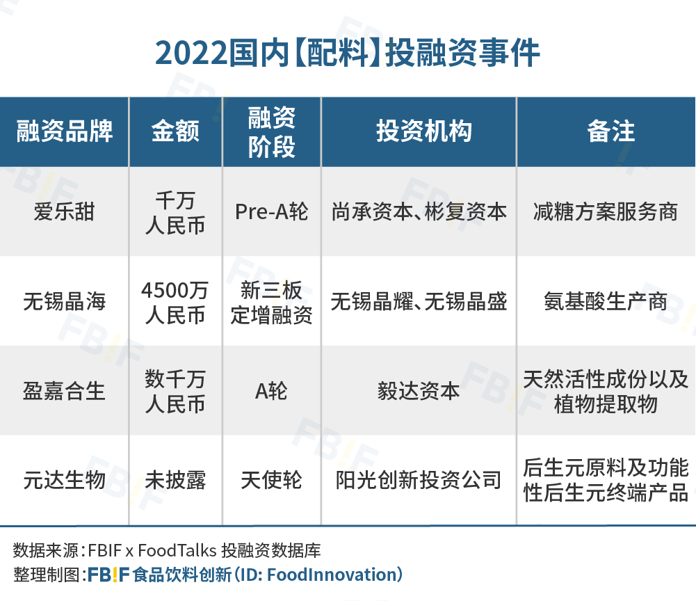 配料赛道有4家公司获得融资,除了未披露金额的专注后生元产品的元达生物外,其余三家融资额均为千万元级,包括专注糖的爱乐甜和盈嘉合生,以及氨基酸生产商无锡晶海。