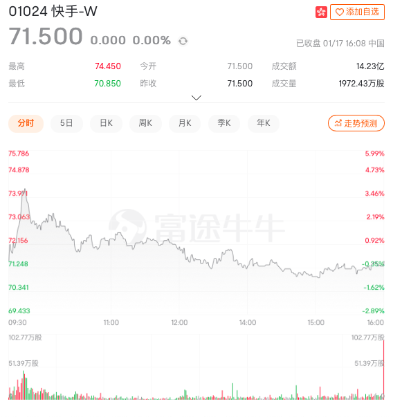 截止2023年1月16日,快手收盘价为71.5港元/股。快手的招股书显示,陈定佳拥有0.53亿股,其所持股票市值约为37.90亿港元。