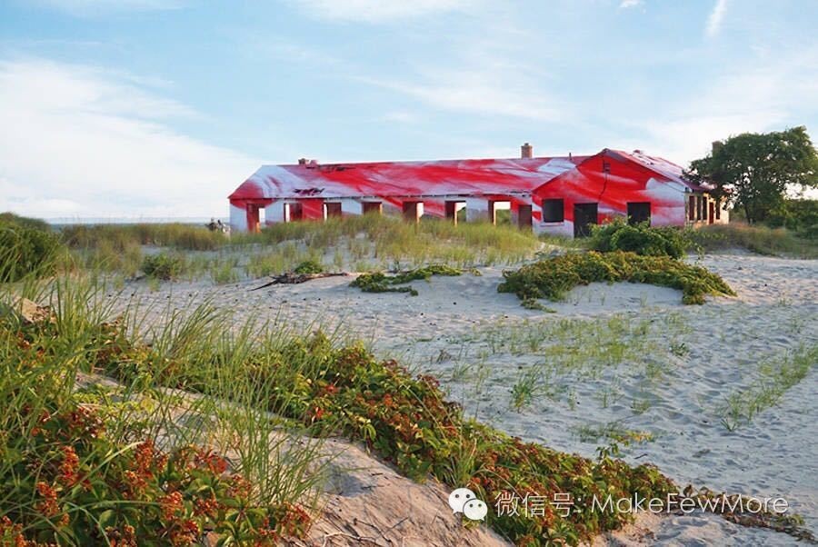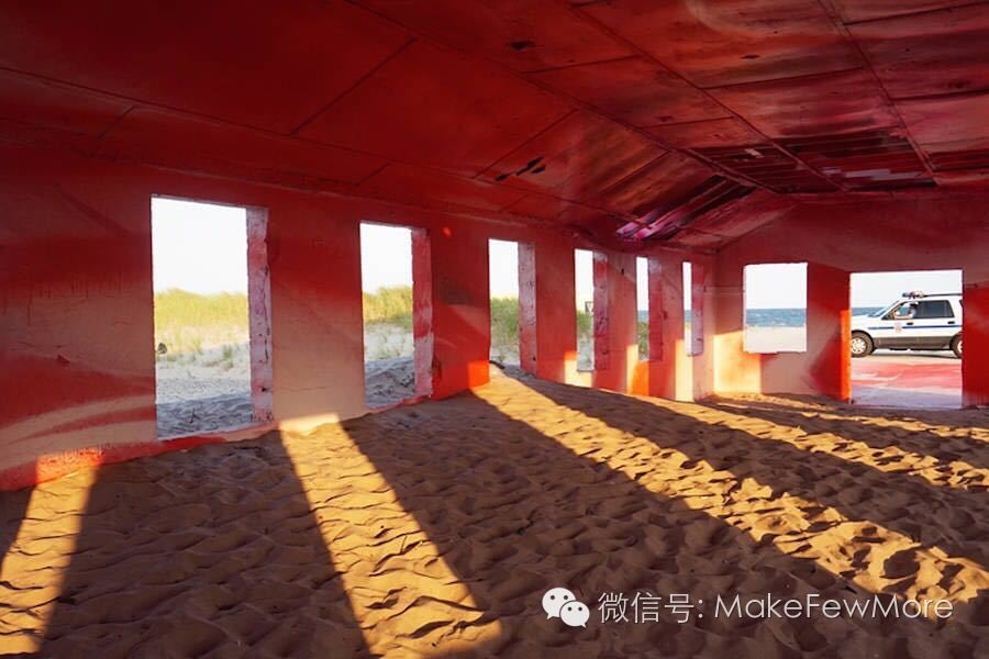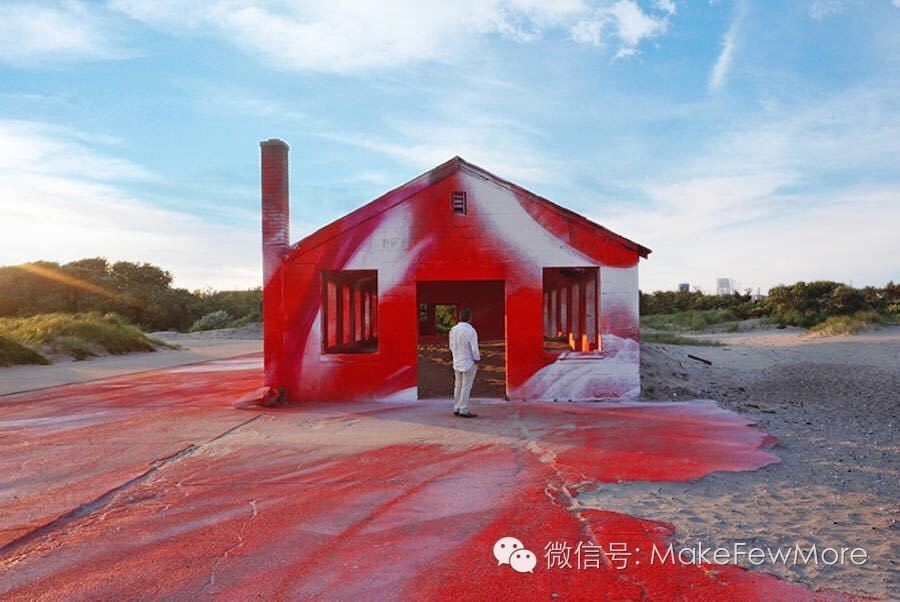 她将各种颜色弥漫在各处,遍布房间的各个角落和每一扇门。无孔不入的色彩构建出自身的空间,抹平了建筑空间原有的结构和一切功能性的部件。从建筑外部放眼望去,透过大窗户可见深浅不一的红色调子和这一平房建筑的绿色外墙形成强烈的对比。