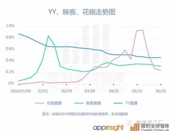 根据猎豹全球智库发布的直播行业报告显示,映客和花椒分别在第一和第二季度的中国移动互联网渗透率上对YY LIVE实现反超,但又很快滑落。