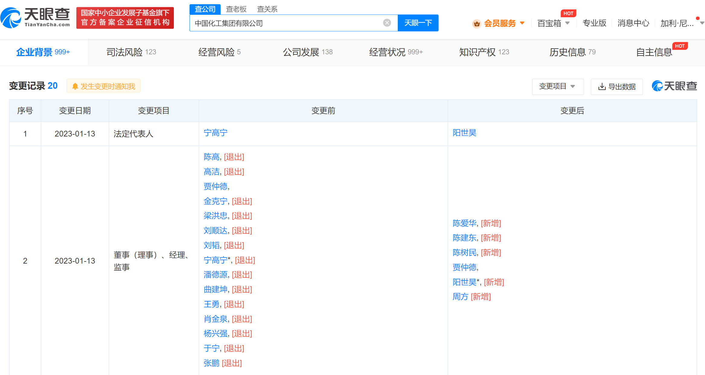 天眼查App显示,1月12-13日,中国中化集团有限公司、中国化工集团有限公司发生工商变更,宁高宁卸任两家公司法定代表人,分别由李凡荣、阳世昊接任;同时两公司多位主要人员发生变更。