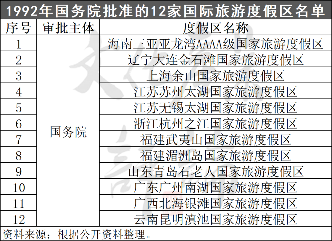 同年10月,国务院正式批复同意大连金石滩、青岛石老人、江苏太湖等11处为国家旅游度假区,1993年国务院批复同意将江苏太湖国家旅游度假区拆分更名为“苏州太湖国家旅游度假区”和“无锡太湖国家旅游度假区”,因此首批国家旅游度假区共12家。