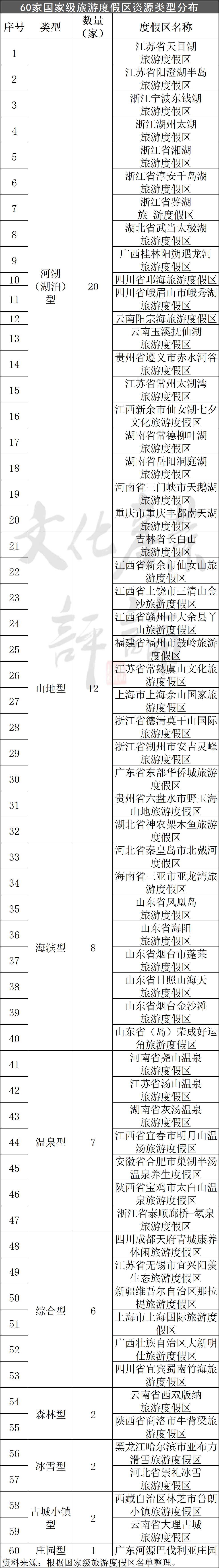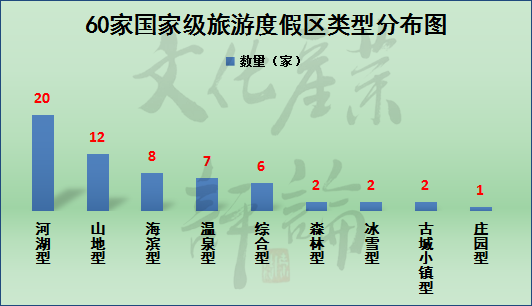据文化产业评论(ID:whcypl)分类统计,在现有的60家国家级旅游度假区中,河湖型有20家,山地型有12家,海滨型有8家,温泉型有7家,综合型有6家,冰雪、林森和古城小镇型各2家,庄园型1家。其中,河湖型、山地型旅游度假区占据绝对优势,温泉和滨海旅游度假区异军突起。