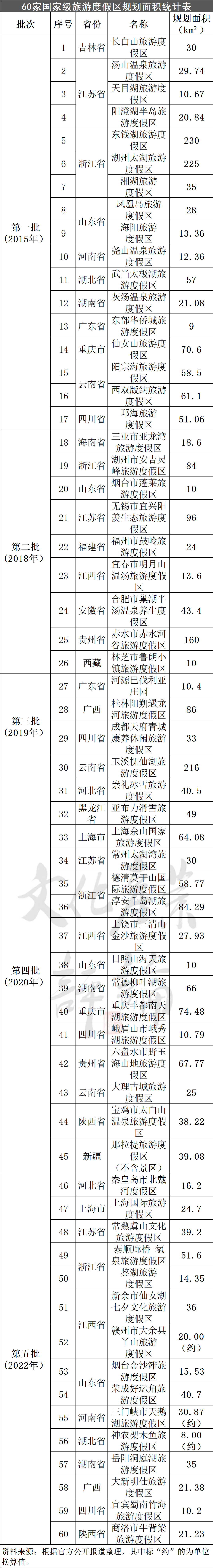 2022年出台的《旅游度假区等级划分》(GB/T 26358-2022)规定,国家级旅游度假区规划建设面积应“不小于5平方公里”(此前为不小于8平方公里)。从5批次60家度假区面积看,各度假区规划面积差异较大,从10平方公里到数百方公里不等(详见下表)。其中,总规划面积超过200平方公里就有3家,分别是浙江东钱湖旅游度假区(230km2)、浙江湖州太湖旅游度假区(225km2)、云南玉溪抚仙湖旅游度假区(216km2)。
