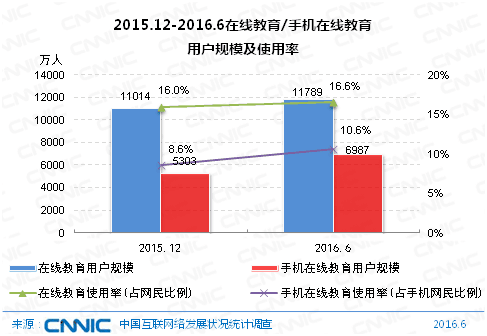 在宏观政策和互联网信息技术进步等众多因素的作用下,中国在线教育市场快速发展。根据中国互联网络信息中心 (CNNIC) 近期发布的《第38次中国互联网络发展状况统计报告》,截至2016年6月,我国在线教育用户规模达1.18亿,较2015年底增加775万,增长率为7.0%;在线教育用户使用率为16.6%,较2015年底基本持平。手机在线教育用户规模为6987万,与2015年底相比增长了1684万,增长率为31.8% ;手机在线教育使用率为10.6%,相比2015年底增长2个百分点。