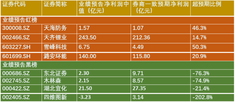 由于每日披露业绩预告的公司数量较大,出于信息量考虑,界面新闻研究部选取了最具备价值的业绩红黑榜。业绩红榜是指业绩预告净利润中枢值高于券商一致预测净利润5%以上的公司,代表业绩超过预期,投资者可重点关注;业绩黑榜则代表业绩预告净利润中枢值低于券商一致预测净利润10%以上的公司,代表业绩低于预期,投资者应注意风险。