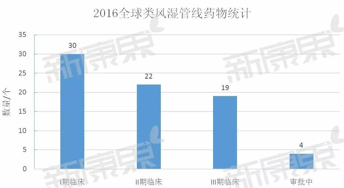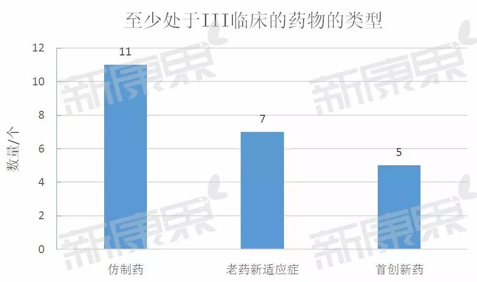 我们把这23个至少处于III期临床研究的药物分为三类:仿制药、老药新适应症和首创新药,其中仿制药最多占据了11个,它们大多是仿制目前最畅销的类风湿性关节炎药物修美乐、恩利等。又有7种药物是进行新适应症研究的老药,由于类风湿性关节炎属于自身免疫疾病的一种,治疗其他自身免疫疾病的药物也有可能会对类风湿性关节炎有较好的疗效。