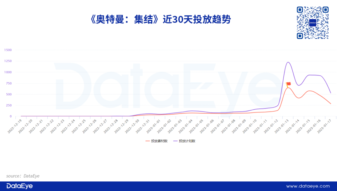 22年12月底,《奥特曼:集结》公布上线时间后,项目组就进行少量的素材测试,日均投放量不超过100组。直到产品在1月13日上线当天,素材投放才有所提升,《奥特曼:集结》投放量飙升超过600组素材,而后投放量维持在400组左右,整体投放力度并不大。