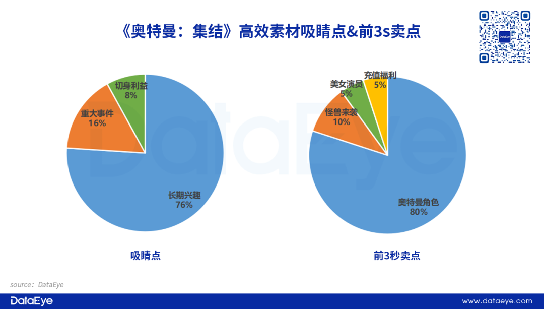 从吸睛点-前3秒卖点来看:侧重突出奥特曼角色。《奥特曼:集结》和大多数IP游戏产品一样,主要以IP作为切入点。《奥特曼:集结》的高效素材主要展示奥特曼IP的主要角色,例如迪迦、泽塔等知名角色,通过角色动作、技能以及相关BGM吸引到对IP感兴趣的玩家。除此之外,高效素材中也有一些“套路”素材,例如角色分析、充值福利等等。值得注意的是这游戏不搞代言、联动、TVC。