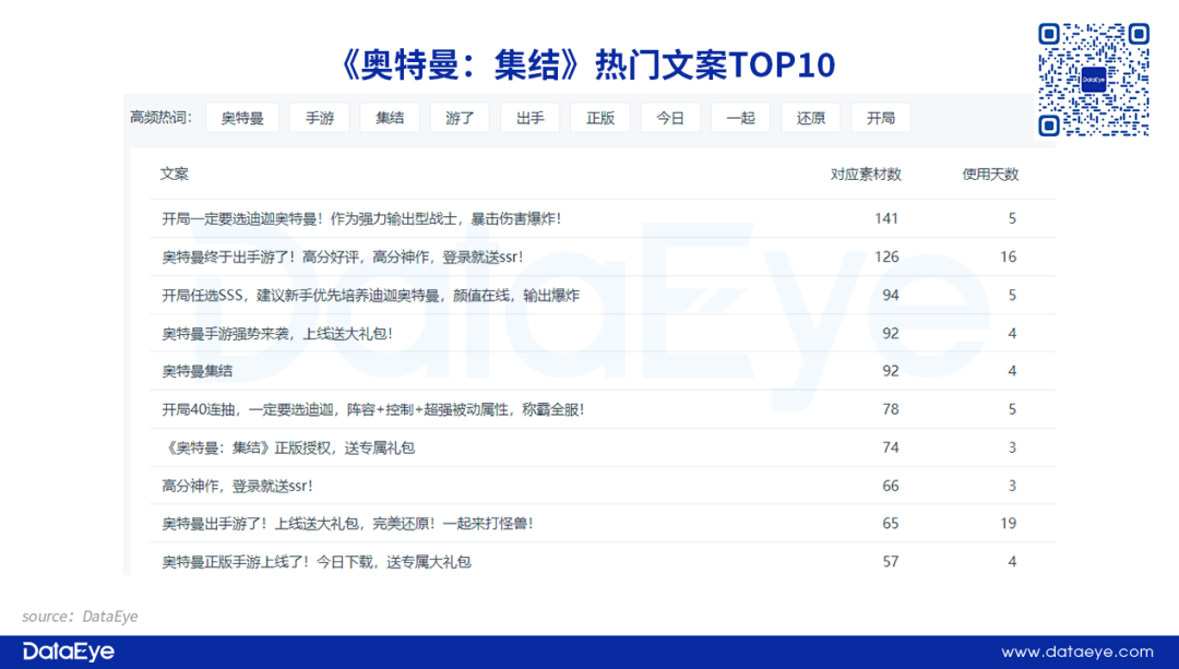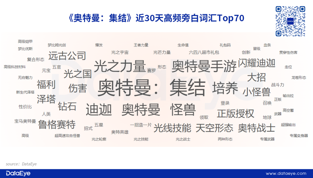 DataEye-ADX投放数据显示,《奥特曼:集结》近30天的高频热词以“正版”“奥特曼”为主,强调产品拥有正版IP授权,突出产品的品牌调性,同时利用IP元素吸引更多玩家的关注。另外,文案标题中也有突出福利元素。