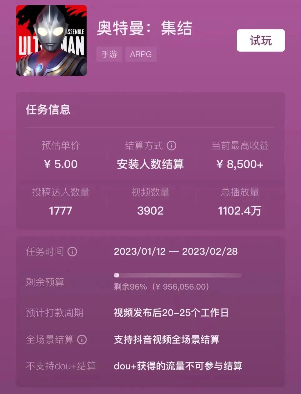 根据抖音游戏发行人数据指出,《奥特曼:集结》此次预计营销费用预算为100W,但预估单价偏低。截至目前,《奥特曼:集结》计划上线已超过5天,剩余预算仍有96%,且参与内容创作的达人不足2000人。