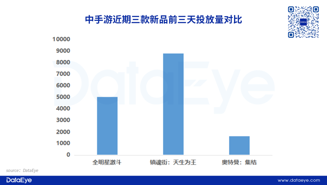 作为对比,中手游近期上线的另一款产品《镇魂街:天生为王》在投放量表现则略微强势。上线当日投放素材量接近5000组,而后逐渐趋向平缓,整体投放力度高于《奥特曼:集结》。