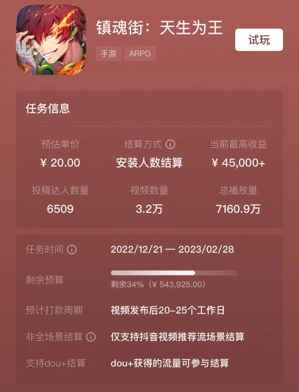 在达人营销方面,《镇魂街:天生为王》在游戏发行人计划更加强势。根据DataEye研究院此前对《镇魂街:天生为王》的达人营销情况进行观察,在该产品上线初期,当时预估单价约为15/A,而目前的预估单价已经达到20/A,呈上涨趋势。