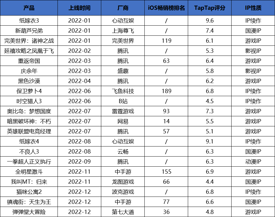 DataEye研究院认为,2022年IP改编游戏喜忧参半,一大问题是:如何满足IP核心用户的诉求。