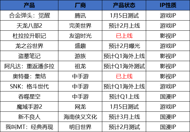 随着国内游戏市场版号常态化,2023年将会有一大批IP游戏上线。DataEye研究院不完全统计,2023Q1将有超过10款IP游戏上线/测试(整理如图所示),后续表现如何,值得持续关注。