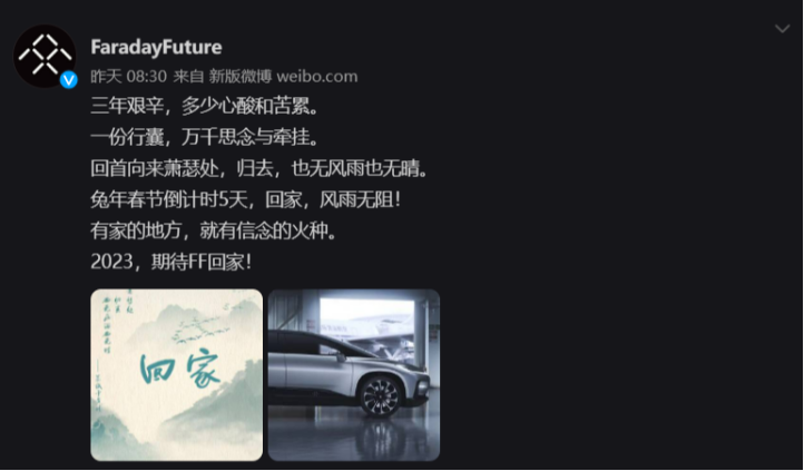 1月17日,FF官方发布一则消息,或暗示FF 91 Futurist将在新年之际回国。不过外界认为,其实更想回国的是FF创始人贾跃亭。