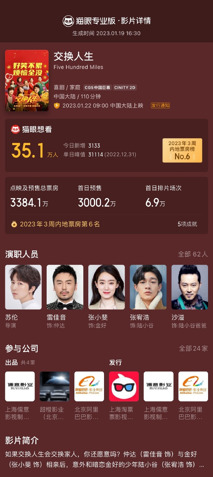 电影《交换人生》首日预售票房突破3000万