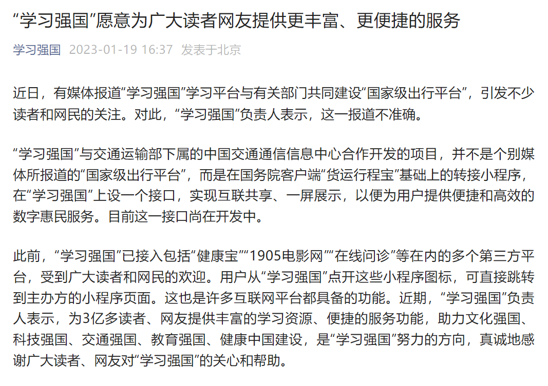 “学习强国”微信公众号1月19日消息,近日,有媒体报道“学习强国”学习平台与有关部门共同建设“国家级出行平台”,引发不少读者和网民的关注。对此,“学习强国”负责人表示,这一报道不准确。